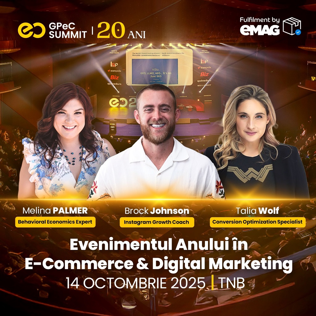 Pe 14 octombrie are loc GPeC SUMMIT – Evenimentul Anului în E-Commerce și Digital Marketing care se va desfășura la Teatrul Național București și este considerat cel mai important eveniment de profil din Europa Centrală și de Est, ajuns la al 20-lea an de tradiție. Organizatorii aduc pe scenă unii dintre cei mai apreciați speakeri de-a lungul timpului, dar și speakeri în premieră în România, pregătind un line-up de tip “Best Of” prin care marchează ediția aniversară de 20 de ani. Biletele sunt disponibile spre vânzare pe site-ul GPeC.ro, iar prețul pornește de la doar 89 EUR + TVA/persoană până pe 22 septembrie, când expiră oferta Early-Bird.